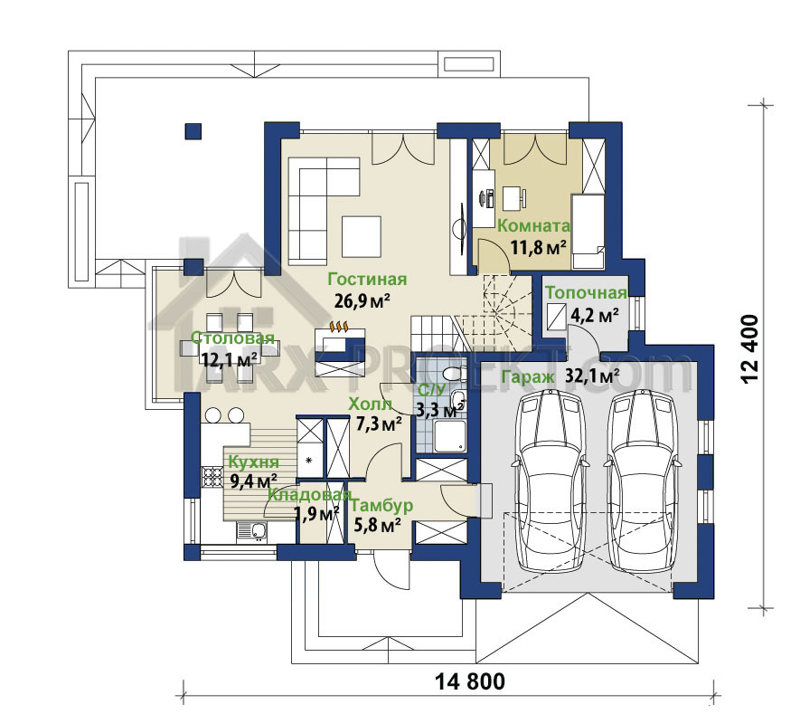 Проект дома «Артем 2» есть также в версии с гаражом на один автомобиль «Артем«.