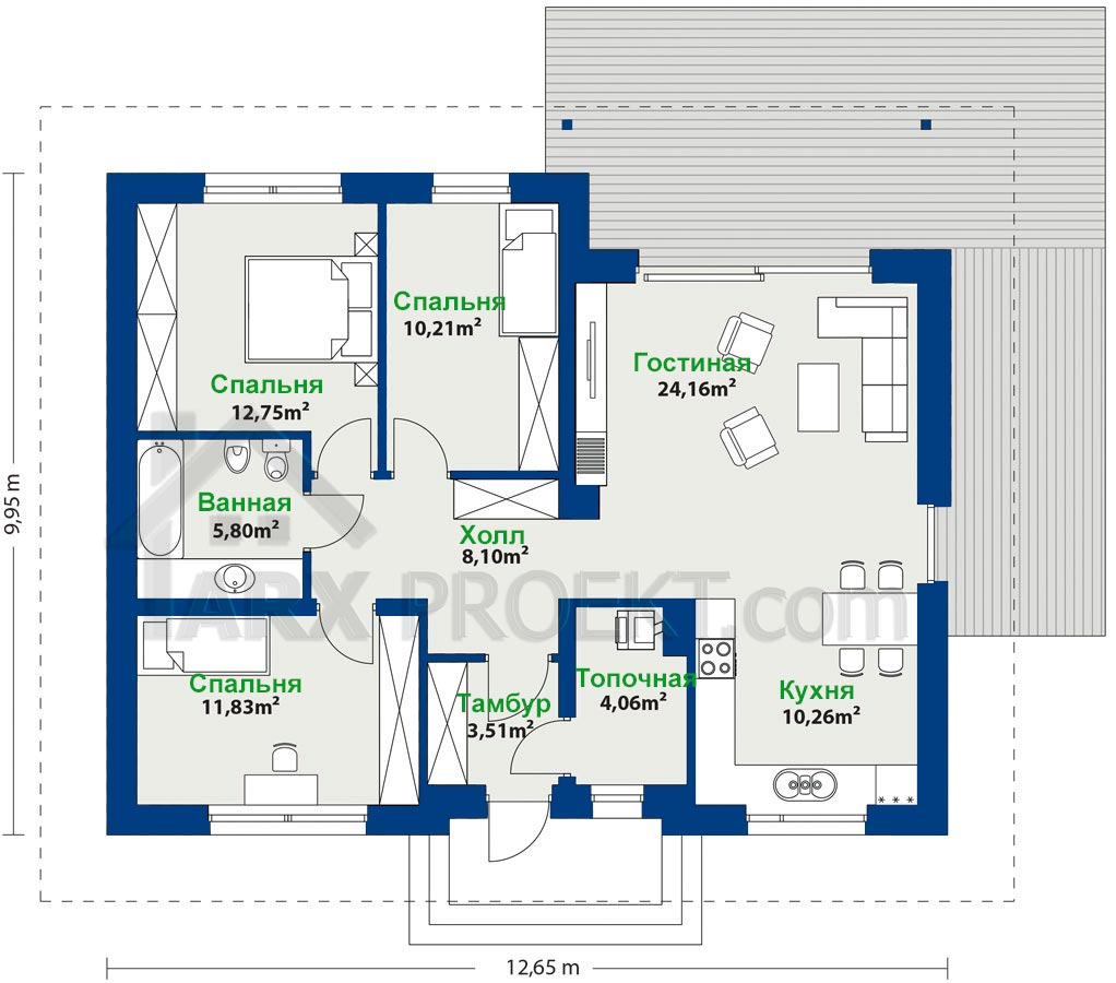 Габариты дома — 12,65 м (ширина)