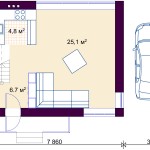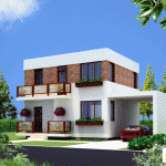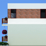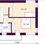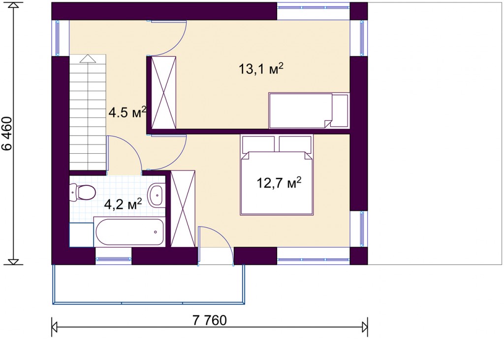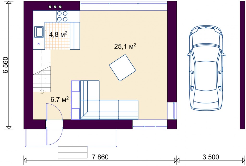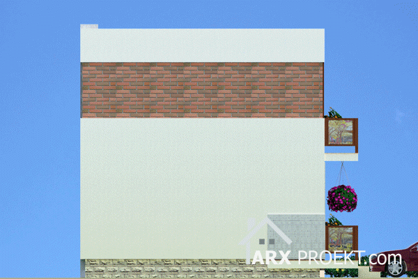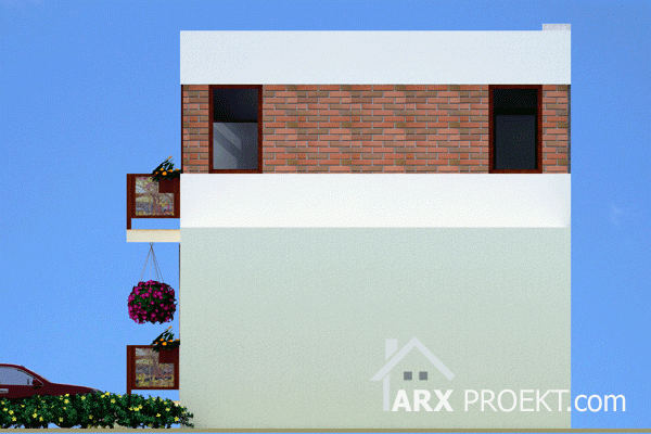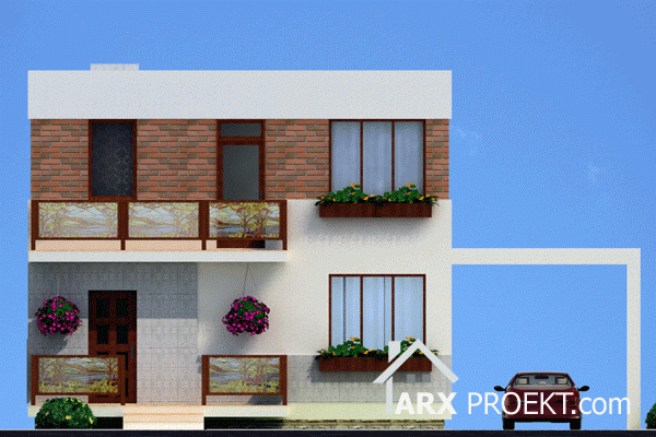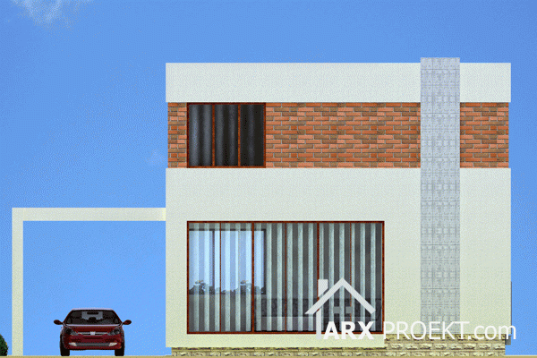 Особенность: Маленький, простой в планировании и строительстве дом, стоимость возведения которого равен первому банковскому платежу на кредит квартиры такой же площади. Внешне дом современный и неординарный. Планирование — открытое. На первом этаже кухня переходит в гостиную, есть навес для авто, а на втором — две спальни и санузел.