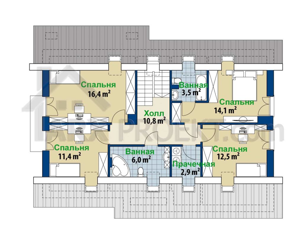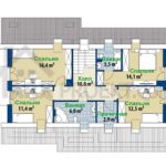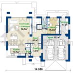 Опис проекта: Простой в строительстве проект дома с мансардой 15м х 11м, с гаражом для двух автомобилей и 5 комнатами. Дом покрыт двускатной крышей. На первом этаже кухня-столовая с камином, переходит в одном пространстве в гостиную. Из столовой и гостиной можно выйти на просторную террасу, накрытую частично навесом крыши. Есть санузел с душевой, с тамбура переход в гараж. Позади гаража есть топочная. Также из холла можно попасть в комнату, которая может быть кабинетом. На мансардном этаже — 4 спальни и отдельная ванная комната и прачечная. Одна из спален с собственной ванной комнатой.
