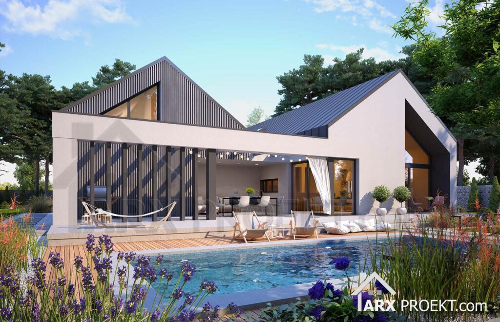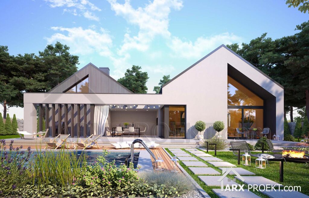 Описание проекта: Проект одноэтажного дома 195 м², с эксплуатируемым чердаком, гаражом на два авто, камином, вторым светом и террасой в стиле барнхаус