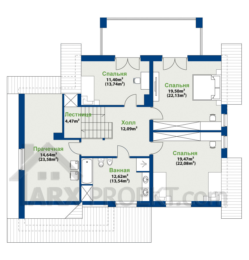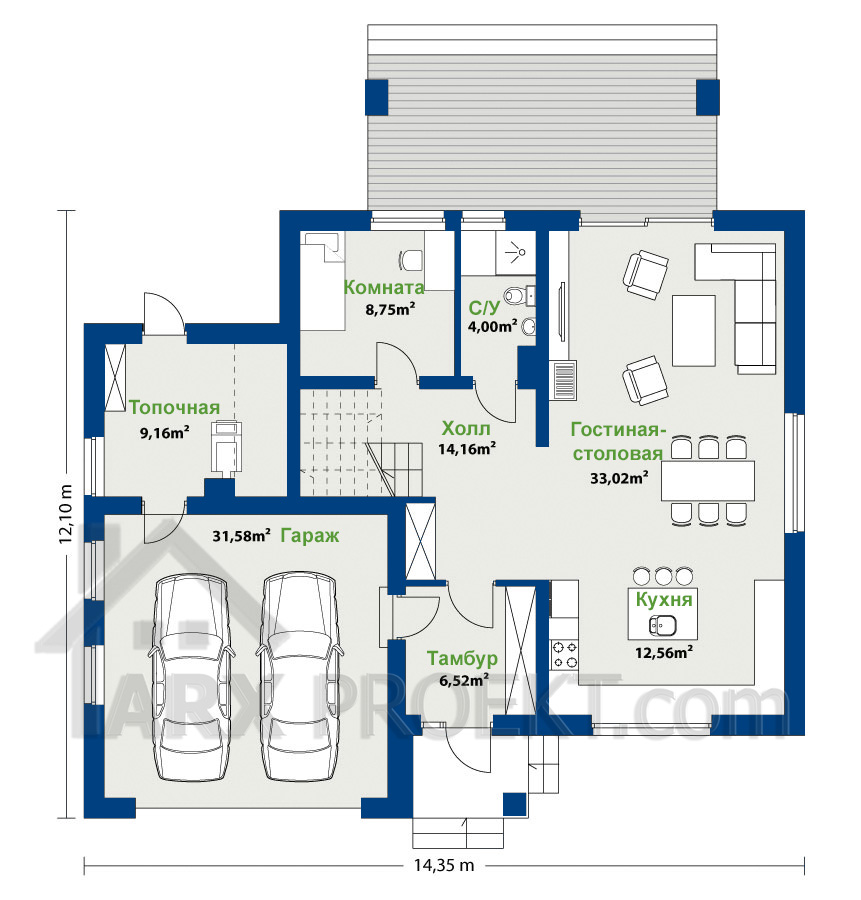 Описание проекта: Интересный проект мансардного дома с гаражом на 2 авто пятью жилыми комнатами, камином и террасой. На первом этаже дома представлена дневная зона. Она состоит из открытой зоны кухни и гостиной, с выходом на крытую террасу, небольшого санузла, комнаты рядом и гаража с топочной. Мансардный этаж содержит три спальни, большую ванную комнату и прачечную.