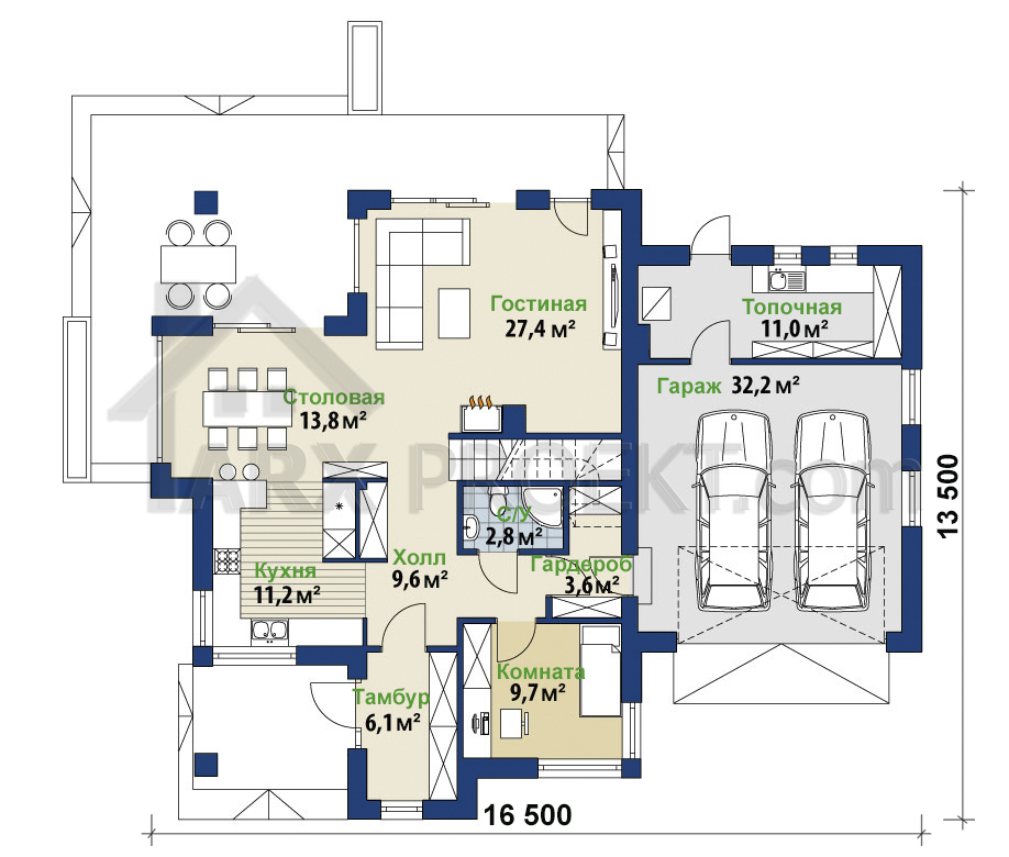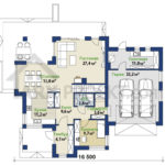 Опис проекту: Красивый проект двухэтажного дома 16х13 на 5 комнат, с гаражом для двух машин, камином и террасой в современном стиле.