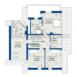 Описание проекта: Удобный, несложный в строительстве дом 13м * 13м, с гаражом для одного авто, предназначен для семьи из 5 человек. Простой в форме дом покрыт двухскатной крышей. На первом этаже гостиная с камином, столовая, кухня отделена раздвижными дверями от столовой. Дополнительная комната на первом этаже с выходом на террасу. В гостиной есть выход на крытую террасу. Также есть санузел с душевой, с тамбура есть переход в гараж и топливную позади гаража. На мансардном этаже есть 3 просторные комнаты. В большей спальне есть дополнительная ванная комната и выход на просторный балкон над террасой. Кроме того, есть большое подсобное помещение над гаражом.