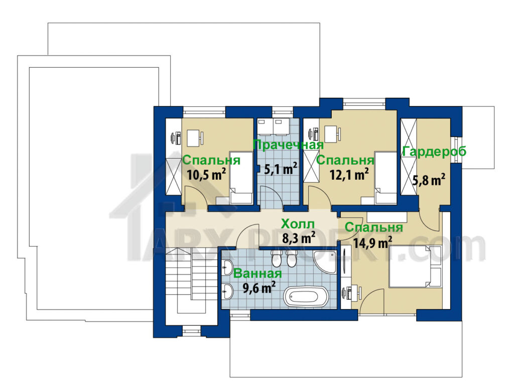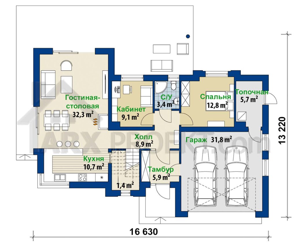 Описание проекта: Проект двухэтажного дома 188 м.кв. с плоской крышей, террасой, камином и гаражом на 2 авто. Современный дом, в котором формы фасада подчеркиваются линиями террас и балконов, навесами и панорамными окнами гостиной и спален, в котором много пространства и планировочных удобств для повседневной жизни и отдыха . На первом этаже дома есть кухня, переходящая в гостиную со столовой и камином. С гостиной и столовой есть выход на летние террасы, одна из которых крытая. Также присутствует гараж для двух авто и топливная позади гаража. На втором этаже три спальни с ванной комнатой, прачечная. С большей спальне есть дополнительная гардеробная комната и выход на большую террасу.