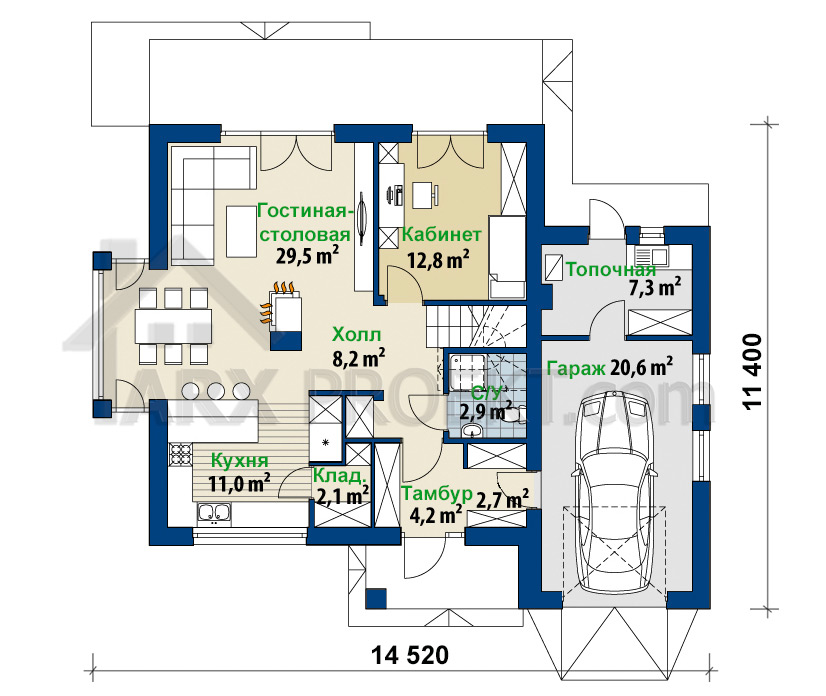 Проект дома «Кейт» есть также в версии с гаражом на 2 авто«Кейт 2«.