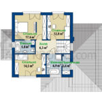 Дом простой в строительстве за счет прямоугольной основы и пристроенного гаража. Функциональное расположение первого этажа — это, главным образом, дневная зона, в том числе гостиная, где можно хорошо провести время у камина, открытая кухня с небольшой кладовой, столовой и гостиной. Площадь первого этажа дополняется кабинетом, ванной комнатой с душем, гаражом на один автомобиль и подсобным помещением / топочной позади него. В вестибюле и в зале есть место для шкафов. Из холла можно подняться по лестнице на второй этаж, где разработаны три спальни, в том числе одна с отдельной ванной комнатой. Другие две спальни также просторные и удобные. Все дополняется общей ванной комнатой, по которой вы идете в прачечную. Небольшая крыша, объединяющая гараж и навес над входом дополняет внешний вид фасада и делает этот дом интересным, который легко вписывается в любое окружение.