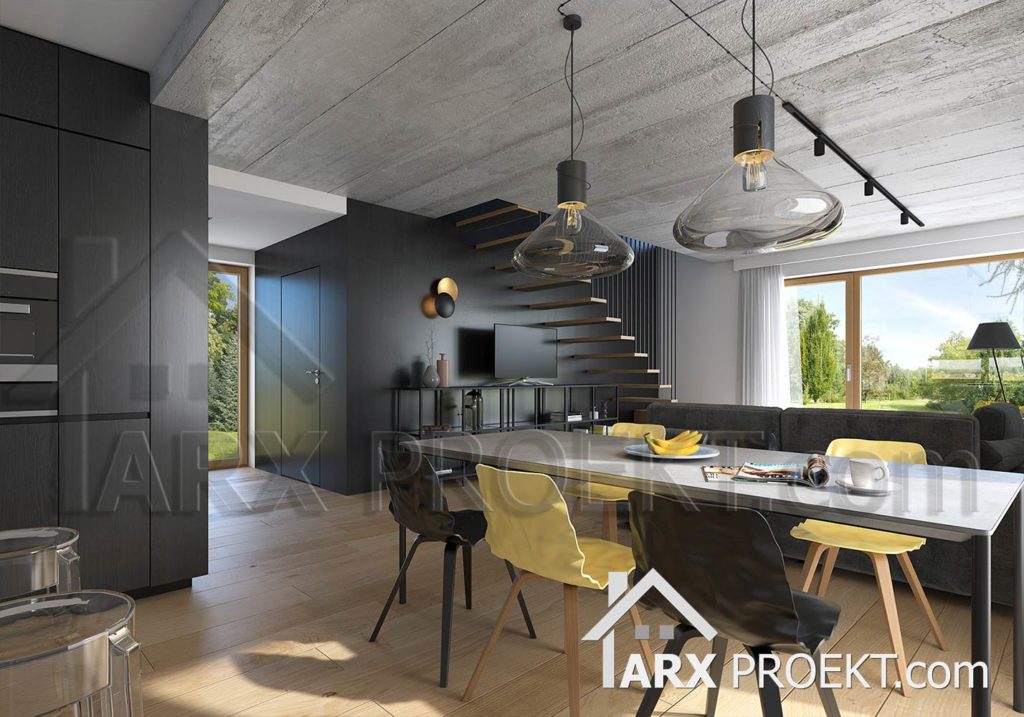 Первый этаж — полностью дневная зона, состоящая из кухни с небольшой кладовой, которая переходит в гостиную-столовую. Есть также небольшой санузел и топочная.