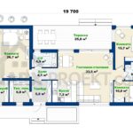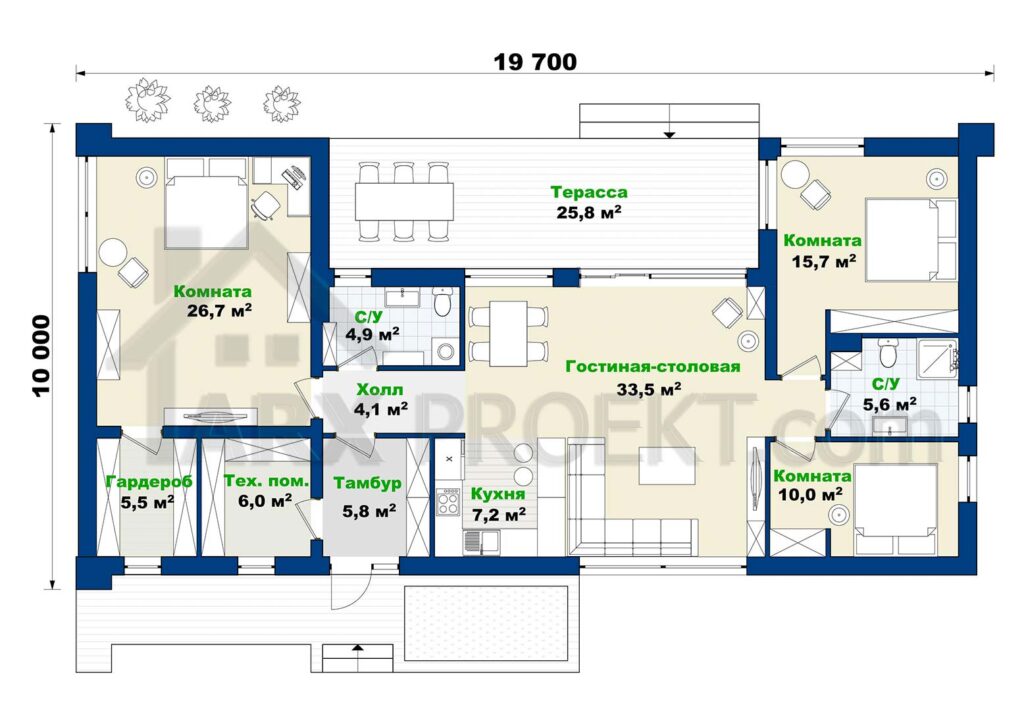Описание проекта: Проект стильного одноэтажного дома с плоской крышей, 10х20 м, площадь 125м², с 3-мя спальнями, без гаража, с крытой террасой.