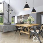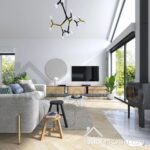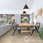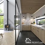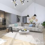 Дневная зона – кухня, которая закрыта перегородкой и переходит в столовую и гостиную с зоной отдыха, с выходом на террасу. В гостиной есть камин.