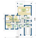 Описание проекта: Проект одноэтажного дома с гаражом для авто и тремя спальнями. Основным преимуществом данного проекта является небольшая жилая площадь с другими функциональными помещениями. Внутреннее пространство имеет четкое разделение на спальни и помещения для повседневной жизни. Традиционная форма здания модернизирована современными отделочными материалами.