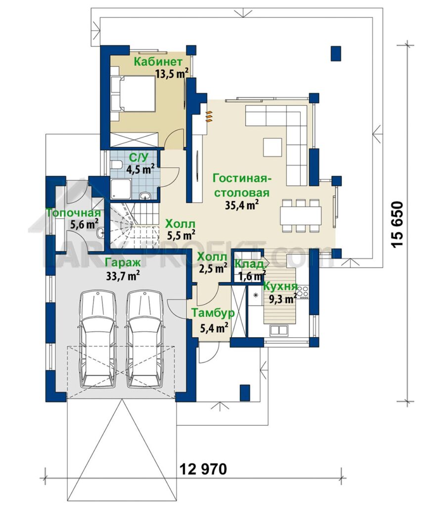 Дом имеет привлекательный внешний вид. Функциональное расположение первого этажа — это, главным образом, дневная зона, в том числе гостиная, где можно хорошо провести время у камина, открытая кухня с небольшой кладовой, столовой в эркере и гостиной. Площадь первого этажа дополняется кабинетом, ванной комнатой с душем, гаражом на два автомобиля и подсобным помещением / топливной позади него. В тамбуре есть место для шкафов. Из холла можно подняться по лестнице на второй этаж, где разработаны четыре спальни, в том числе одна с отдельной ванной и гардеробной комнатами и выходом на террасу. Две спальни одинаковые по размерам, одна с выходом на большую террасу над гаражом. Четвертая спальня маленькая, площадью 11 м.кв. Все дополняется общей ванной комнатой и прачечной. Впереди дома навесом над входом есть терраса над гаражом, которая прекрасно дополняет внешний вид фасада и делает этот дом интересным, который легко вписывается в любое окружение. Позади крыша частично накрывает террасу.