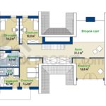 Описание проекта: Современный проект дома для семьи с 4-6-человек, с гаражом на 2 авто, камином, вторым светом и террасой. Интересный, современный дом с мансардой, для людей, которые любят выделяться из толпы. Внимание привлекают многочисленные остекления в дневной зоне. Функциональная компоновка включает открытое общее пространство, в котором гостиная соединена со столовой и кухней. Представительный застекленный зал ведет к удобному для гостей модулю, который состоит из спальни с выходом на террасу, гардероба для одежды и собственной ванной комнаты. Такое сочетание также прекрасно подходит для семей с разными поколениями, обеспечивая пожилым людям ощущение уединенности и близости. Первый этаж дополнен также отдельным туалетом с душевой, кладовой возле кухни, кладовой комнатой с проходом в прачечную и топочной позади гаража. На мансарде есть три спальни: две похожие по размерам, общая ванная комната и модуль (спальня с отдельной гардеробной пространством и собственная ванная комната). Есть также четвертая комната, которая может быть кабинетом / библиотекой. Преимуществом дома есть антресоль с видом на гостиную через второй свет.