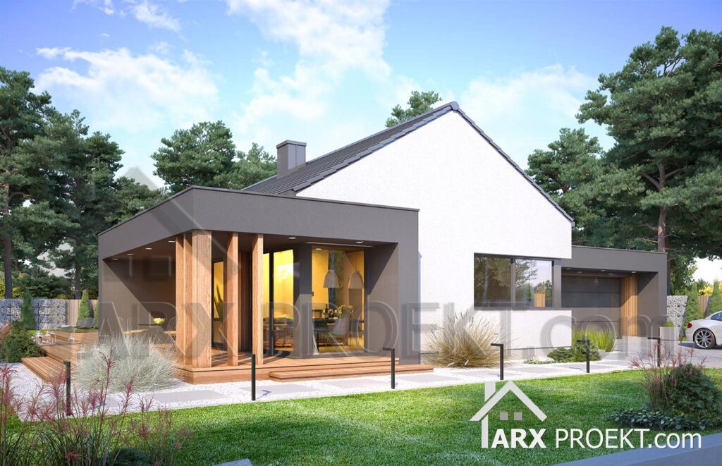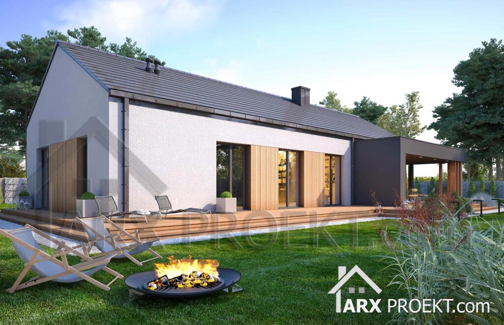 Описание проекта: Проект стильного одноэтажного дома в стиле барнхаус с гаражом на 2 авто, четырьмя комнатами, крытой террасой и камином.
