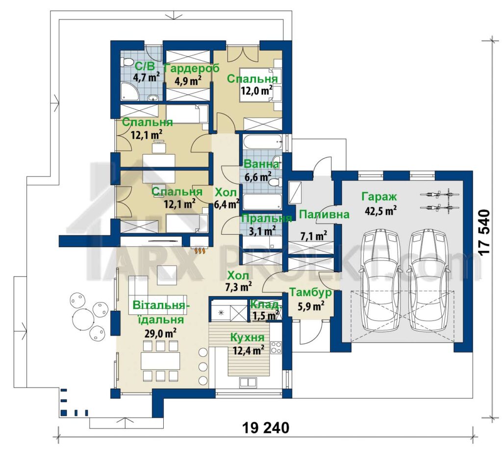 Хозяйственная зона – гараж для двух авто и топливная с выходом во двор.