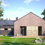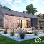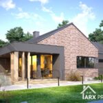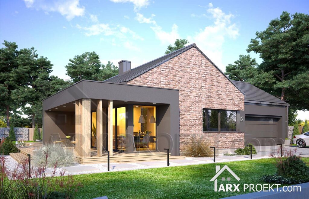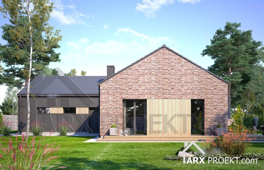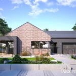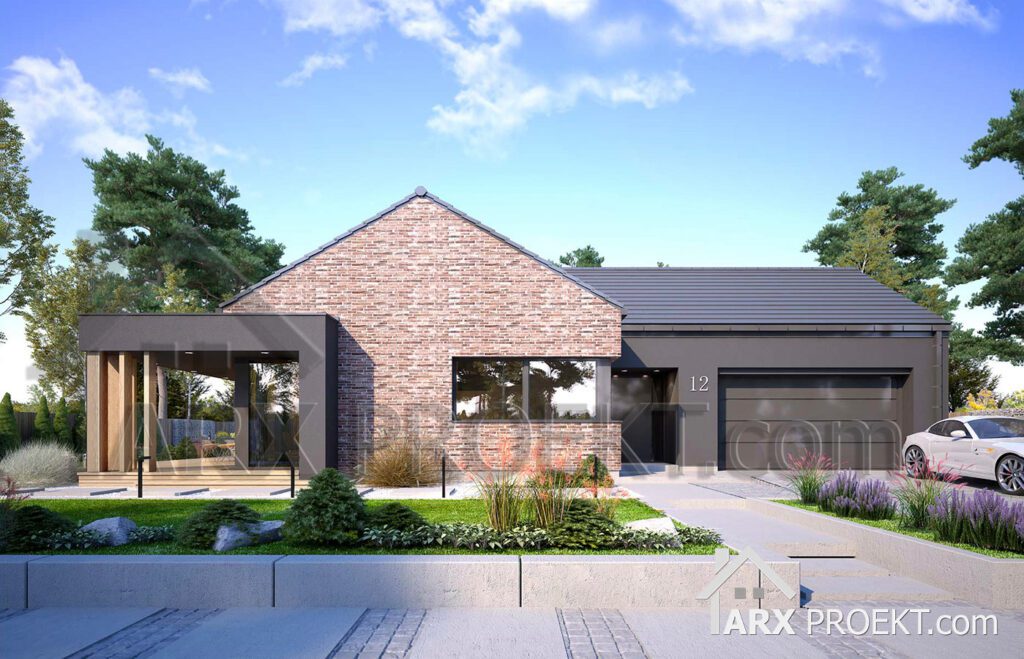 Одноэтажный дом в стиле барнхаус. Фасадные решения представлены в двух вариантах: красный клинкер в сочетании с серой штукатуркой; И в светлом тоне за основу с серыми элементами для контраста.