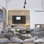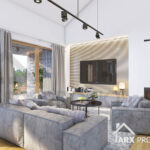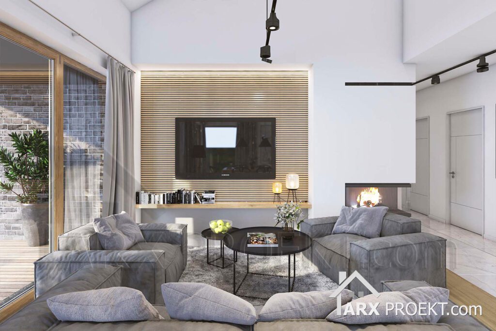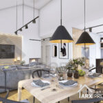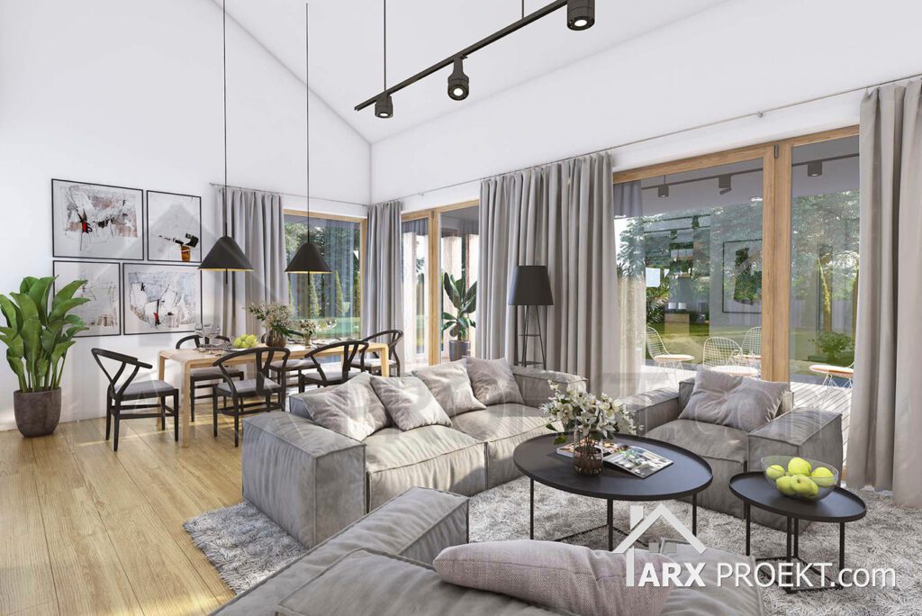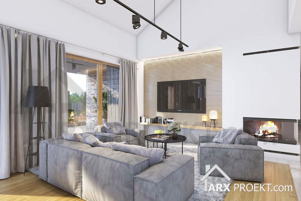 Описание проекта: Проект современного одноэтажного дома в стиле Барнхаус 168 м² с гаражом на 2 авто, тремя комнатами, крытой террасой, вторым светом и камином «Норт 3».