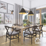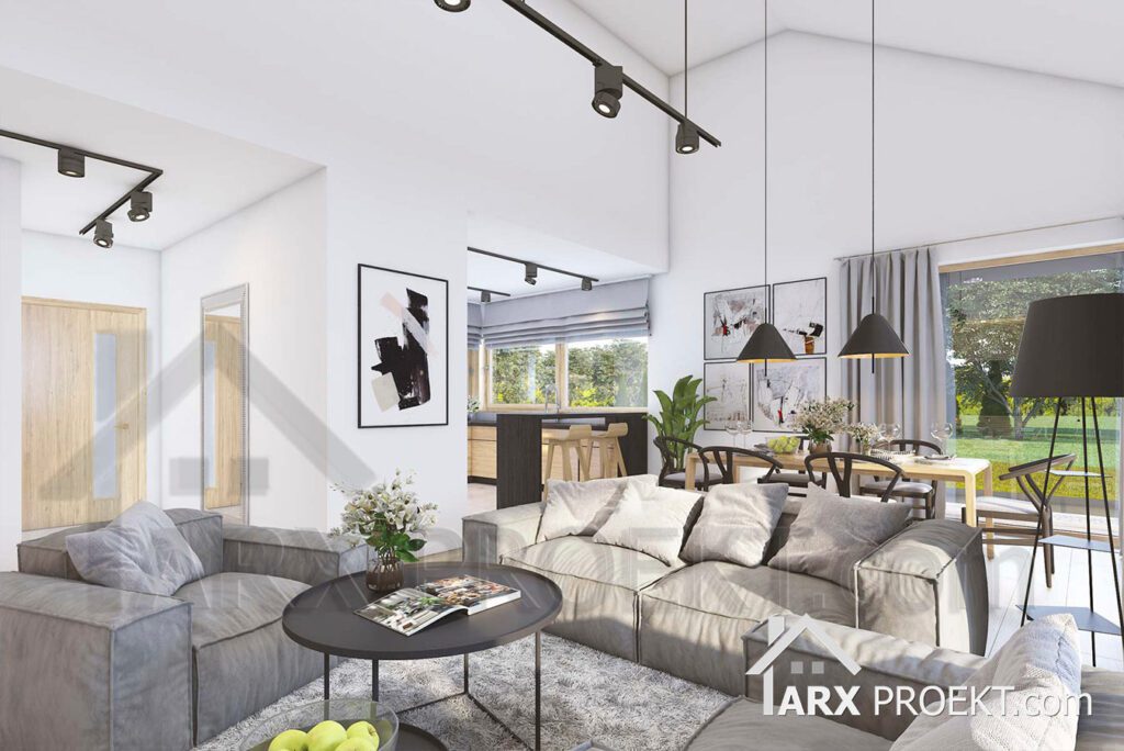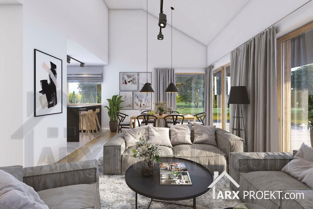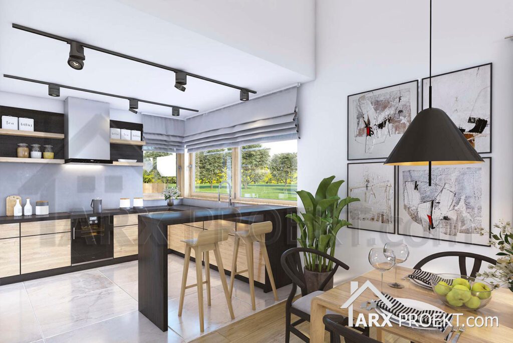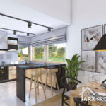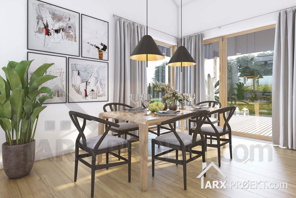 Дневная зона – открытое пространство, где гостиная сочетает в себе столовую и переход в кухню, которая может быть закрыта. Выход на крытую террасу возможен как из гостиной, так и из столовой, что делает этот дом идеальным для послеобеденного кофе или проведения вечера на террасе, защищенной от солнца и дождя. В кухне есть небольшая кладовая. Также из холла есть небольшой санузел с душевой и кладовая.