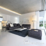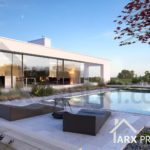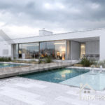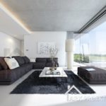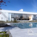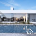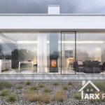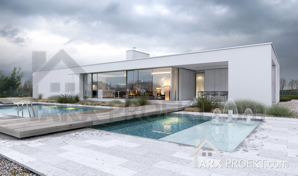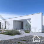 Описание проекта: Проект сучасного одноповерхового будинку з плоским дахом, шириною 10,55м, гаражем на 2 авто, з каміном та критою терасою.