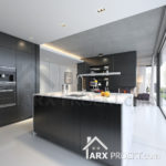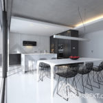 Дневная зона — кухня с островком и переходом в столовую и зону гостиной. Из кухни есть вход в кладовую, рядом топочная и переход в гараж на 2 авто. Из гостиной можно выйти на крытую террасу. Зону гостиной и столовой разделяет камин. Дополняется дневная зона небольшим С/У с душевой при входе в дом.