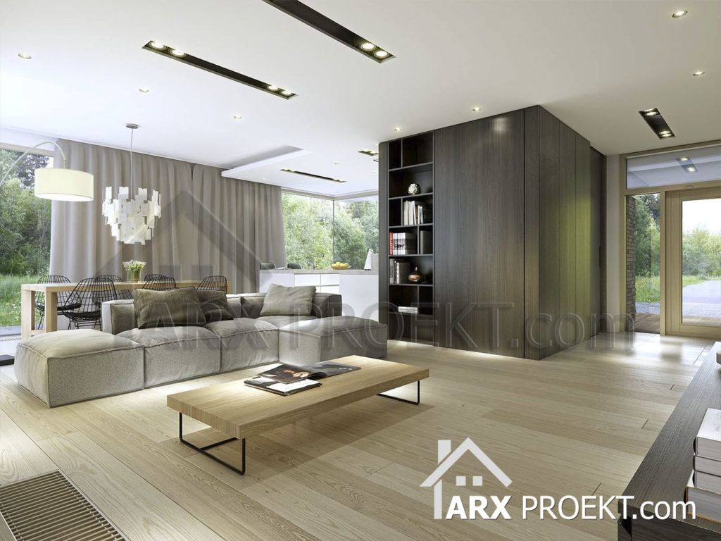 Описание проекта: Стильный проект небольшого одноэтажного дома с плоской крышей, без гаража, с камином и террасой.