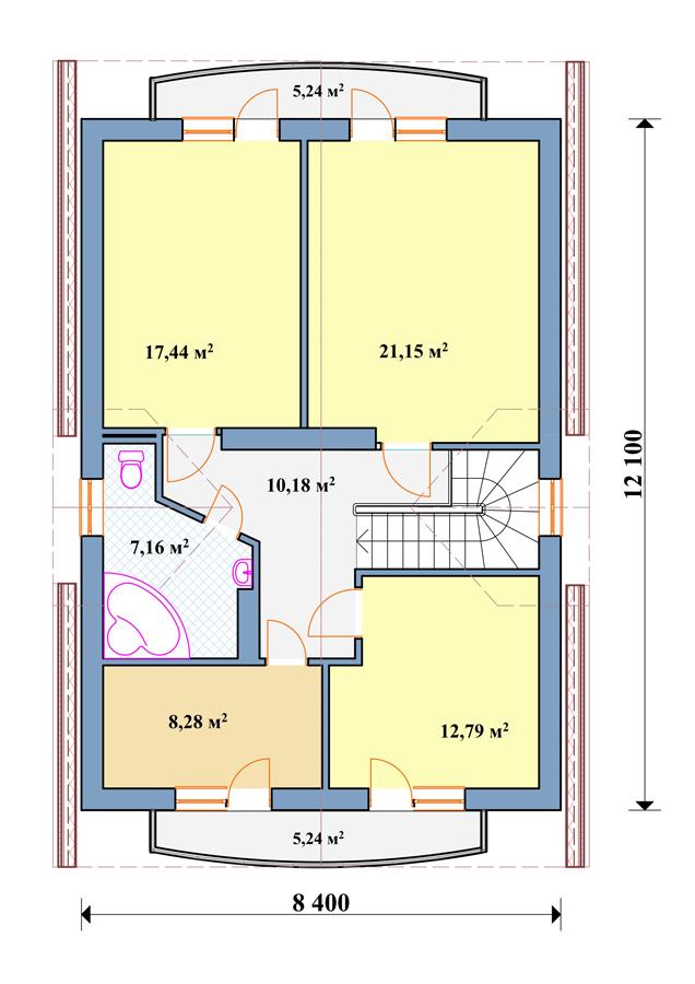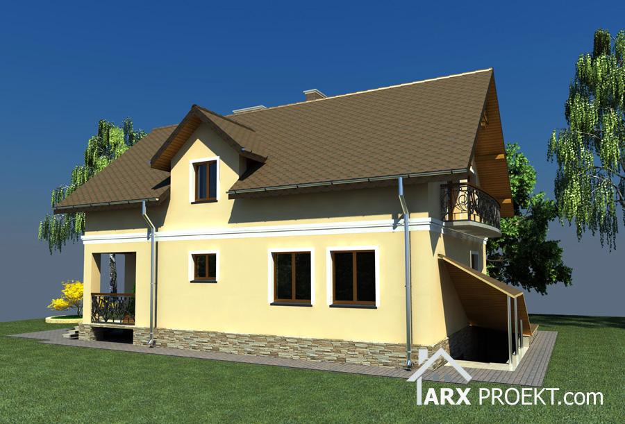 Описание проекта: Проект дома 8м * 12 м с жилой мансардой. Дом простой в строительстве, но украшен деревянными элементами под крышей и белыми полосами по фасаду и вокруг окон. В цокольном этаже дома несколько вспомогательных помещений и топливная. Вход как с улицы, так и по лестнице с середины дома. На первом этаже кухня-столовая, просторная гостиная с камином, санузел и кладовая. Этажом выше — три спальных комнаты, гардероб и санузел.