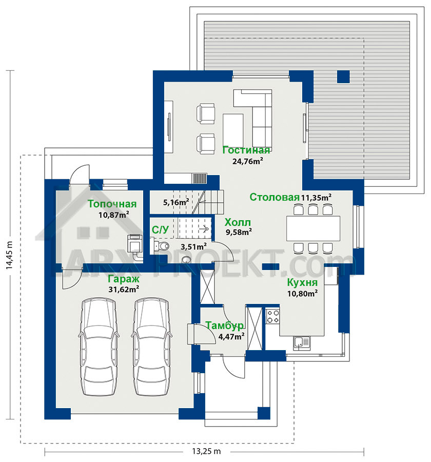Габариты дома – 13,25 м (ширина)