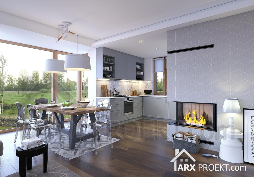 Описание проекта: Проект небольшого дома с мансардой 12х8 м площадью 135 м.кв. на семью из 4-5 человек, с навесом для авто. Вход в дом осуществляется с стороны центрального фасада. На первом этаже находятся: тамбур, санузел, холл, топочная, кухня, переходящая в зону столовой-гостиной. Планировка дома открытая — гостиная совмещена с холлом для большего пространства. Также есть камин. Из гостиной есть выход на частично крытую террасу. Есть также спальня с отдельным гардеробом и санузлом с душевой.