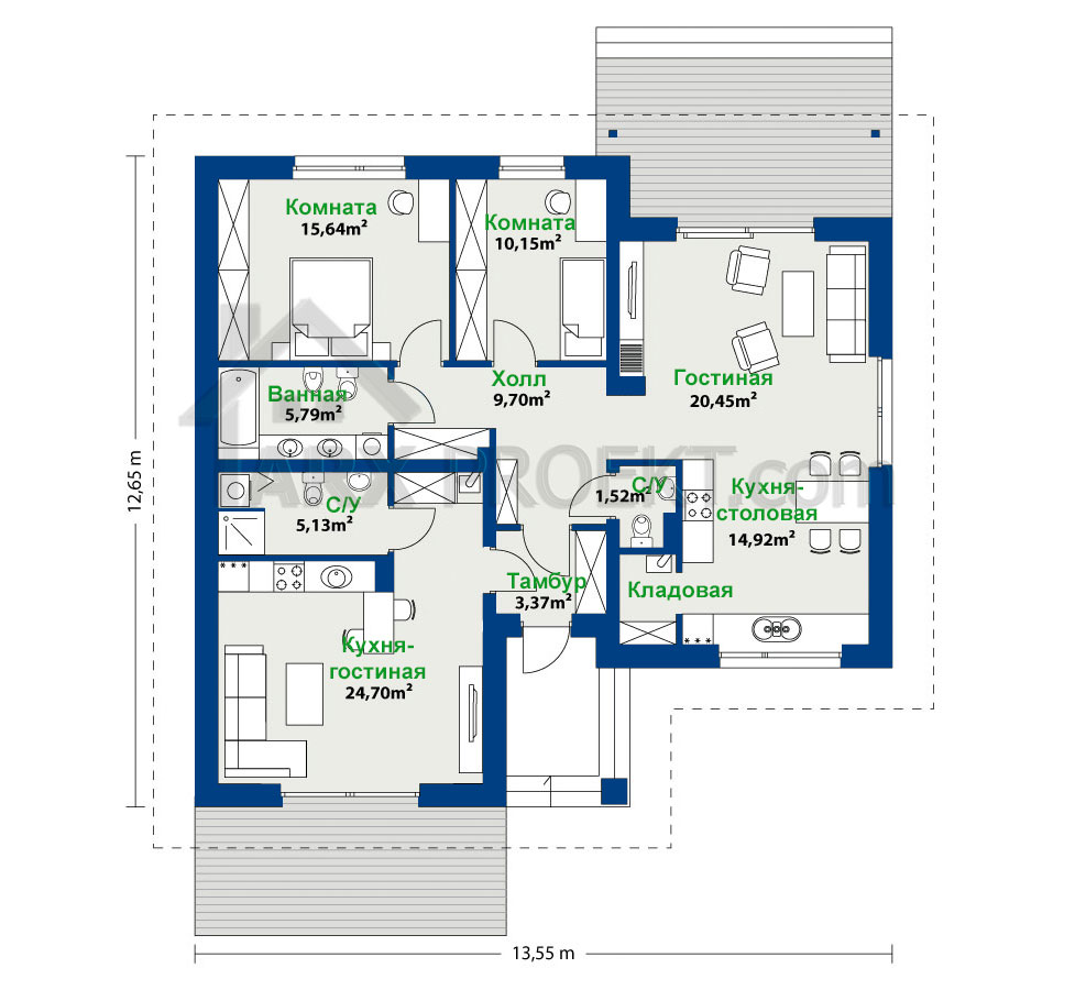 Габариты дома — 12,65 м (длина)