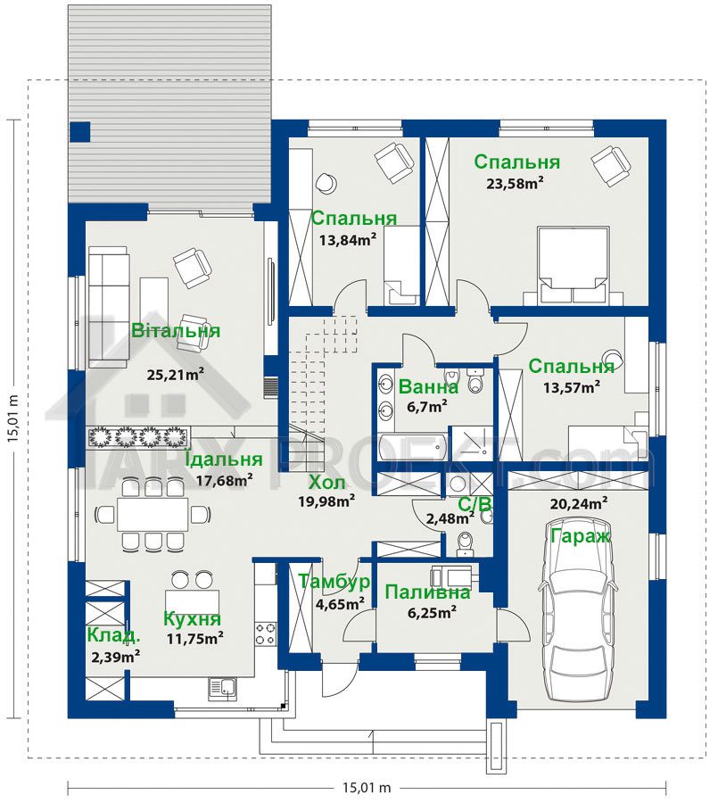Описание проекта: Проект одноэтажного дома 15 на 15, 168 м², с гаражом, с тремя спальнями, камином и террасой «Рой 2».