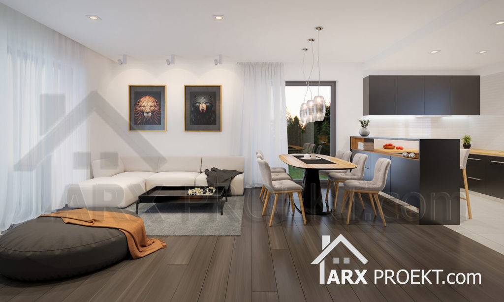 Дневная зона — открытая кухня-столовая с отдельным обеденным столом, которая переходит в гостиную с зоной отдыха, а дальше — выход на террасу. На террасу можно выйти также из спальных комнат. Терраса частично также накрыта. Tсть санузел и небольшая кладовая у кухни.