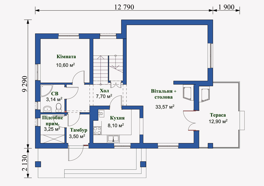 Габариты дома – 12,8 м (ширина)