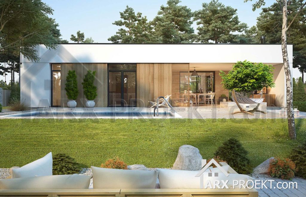 Описание проекта: Стильный проект одноэтажного дома с плоской крышей, гаражом на 2 авто, камином и крытой террасой.
