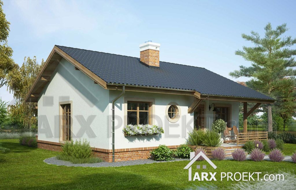 Описание проекта: Проект небольшого одноэтажного дома 70 м.кв., 10 на 9м, с камином и крытой террасой.