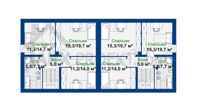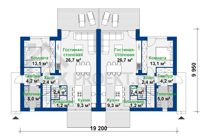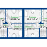 Описание проекта: Красивый проект блочного дома с мансардой 19 х 10 м, рассчитан на две семьи с 4-5 человек. На первом этаже есть кухня с небольшой кладовой рядом, гостиная-столовая с выходом на террасу в заднем дворе. Есть также санузел, топочная и отдельная жилая комната. На мансардном этаже есть три спальни и ванная комната. Из двух комнат есть выходы на французские балконы. Спаренная версия идентична и отраженная.