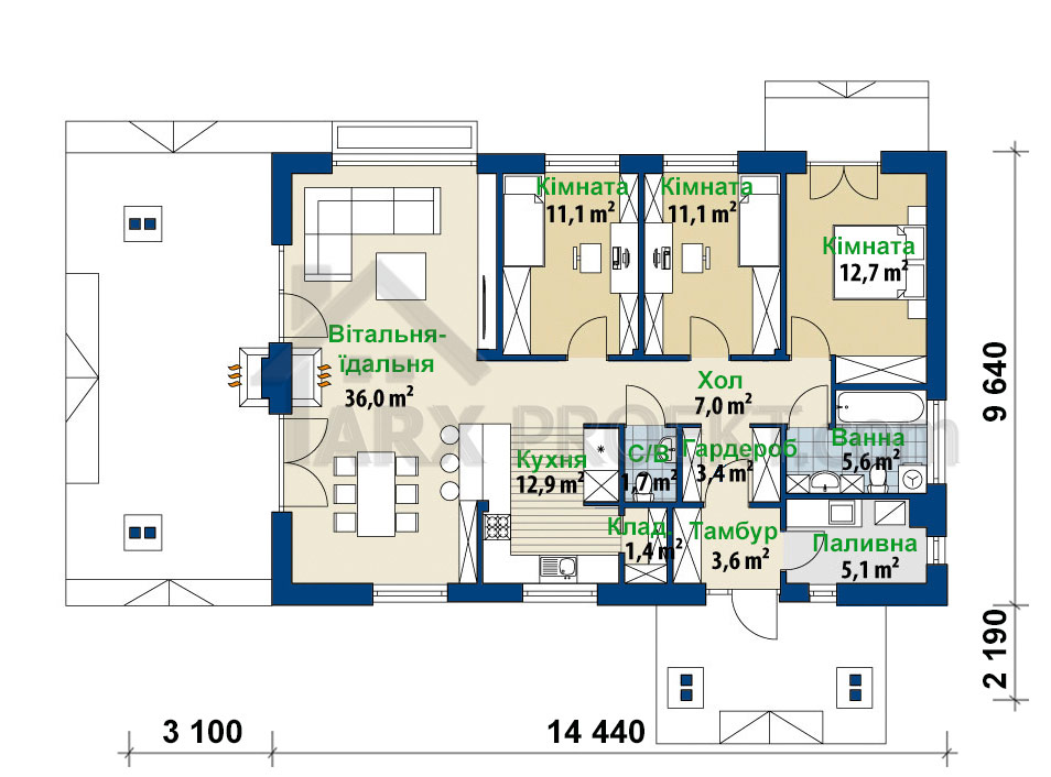 Опис проекту: Проект одноповерхового будинку 111 м.кв. із трьома спальнями, каміном та критою терасою.