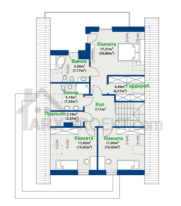 На мансардном этаже есть 3 просторные комнаты. В большей спальне есть дополнительная ванная комната, гардероб при входе и выход на просторный балкон над террасой. Другие две спальни имеют выход на балкон над входом и гаражом. Кроме того, есть общая ванная комната и прачечная.