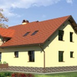 Опис проекту: Проект будинку красивий ззовні та не складний у будівництві на сім’ю із 4-5 осіб. на першому поверсі знайшли місце гараж на один автомобіль, з якого можна потрапити у будинок через паливну, є також санвузол, поруч кімната. Кухня продовжується їдальнею і переходить через напіввідкритий простір у вітальню з каміном. Далі – вихід на літню терасу. На мансардному поверсі три спальні кімнати, ванна кімната та пральня.