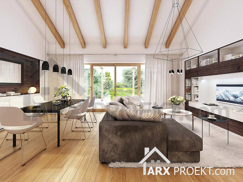 Денна зона – кухня яка переходить у їдальню та вітальню із зоною відпочинку, а далі – вихід на криту терасу. Біля кухні є камін.