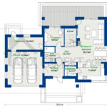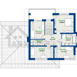 Дом покрыт вальмовой крышей, что упрощает строительство. Функциональное расположение первого этажа – это, главным образом, дневная зона, в том числе гостиная, где можно хорошо провести время у камина, открытая кухня с островком, на котором плита и по другую сторону барная стойка. Столовая и гостиная расположены вдоль кухни. Из гостиной есть выход на крытую балконом террасу. Площадь первого этажа дополняется кабинетом, ванной комнатой с душем, гаражом на два авто и большой топочной позади него. В холле есть место для шкафов. Возле кухни есть также кладовая. Из холла можно подняться по лестнице на второй этаж, где разработаны четыре спальни, отдельная прачечная и общая ванная. Две спальни с выходом на общий балкон. Крыша, объединяющая гараж и навес над входом дополняет внешний вид фасада и делает этот дом интересным, легко вписывающимся в любое окружение.