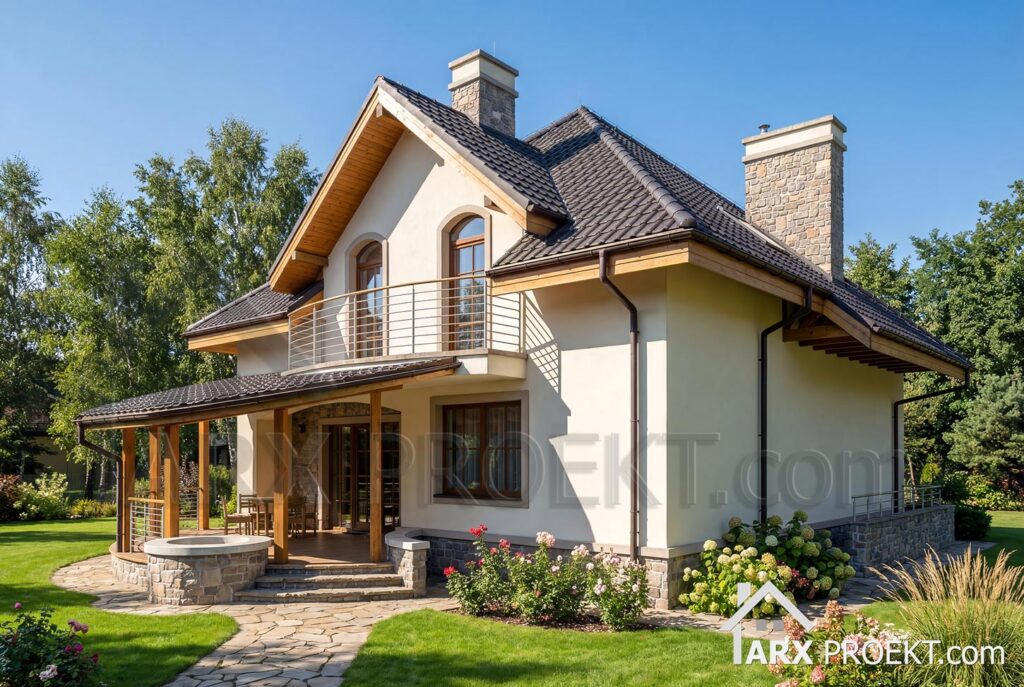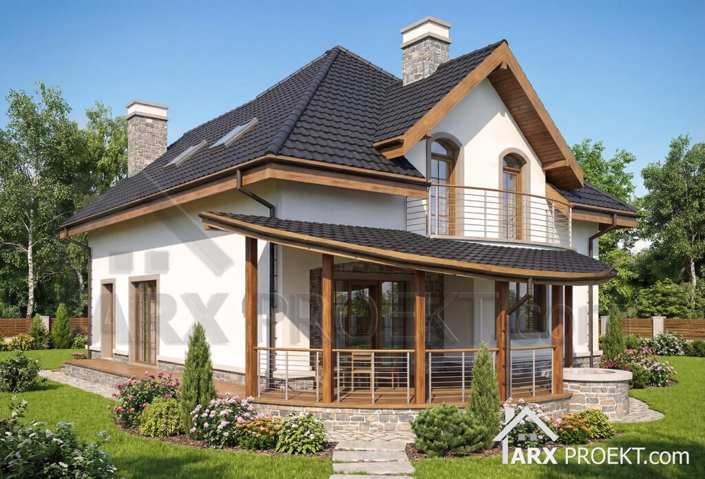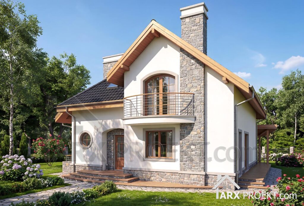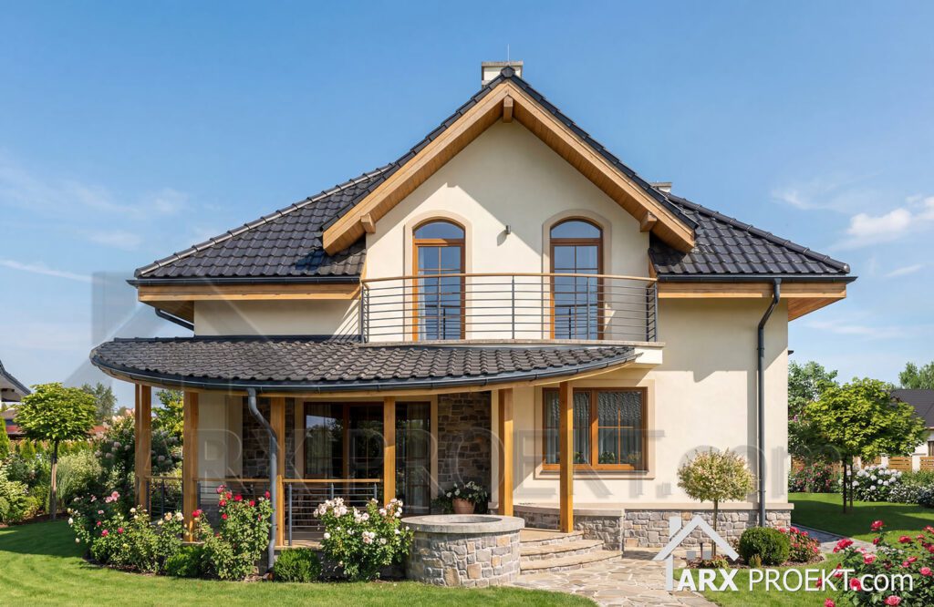 Будинок виділяється унікальною архітектурою та повсякденною зручністю. Котедж має світлий фасад, декоративний камінь, великі вікна, балкон та простора напівкругла тераса, що створюють естетичний вигляд і водночас практичність експлуатації.