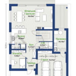 Дом покрыт вальмовой крышей, что упрощает строительство. Функциональное расположение первого этажа — это, главным образом, дневная зона, в том числе гостиная, где можно хорошо провести время у камина, открытая кухня с островком, на котором плита и по другую сторону барная стойка. Столовая и гостиная расположены вдоль тыльной стороны дома, из которой есть выход на крытую террасу через большие остекления. Площадь первого этажа дополняется кабинетом, С/У с душем, гаражом на два автомобиля и подсобным помещением / топочной позади него. В вестибюле есть место для шкафов. Из холла можно подняться по лестнице на второй этаж, где разработаны четыре спальни, в том числе одна с отдельной ванной и гардеробной комнатами. Остальные три спальни похожие по площади. Все дополняется общей ванной комнатой, гардеробной и отдельной прачечной. Также есть выход на чердак через лестницу.