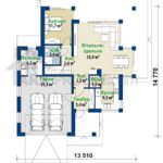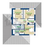 Будинок має привабливий зовнішній вид . Функціональне розташування першого поверху – це, головним чином, денна зона, у тому числі вітальня, де можна добре провести час біля каміна, відкрита кухня з невеликою коморою, їдальнею в еркері та вітальнею. Площа першого поверху доповнюється кабінетом, ванною кімнатою з душем, гаражем на два авто і підсобним приміщенням / паливною позаду нього. У тамбурі є місце для шаф. З холу можна піднятися по сходах на другий поверх, де розроблено три спальні, в тому числі одна з окремою ванною та гардеробною кімнатами. Інші дві спальні також просторі. Все доповнюється спільною ванною кімнатою та пральнею. Спереду будинку дах об’єднує гараж, паливну та навіс над входом і чудово доповнює зовнішній вид фасаду і робить цей будинок цікавим, який легко вписується в будь-яке оточення. Позаду дах частково накриває терасу.