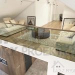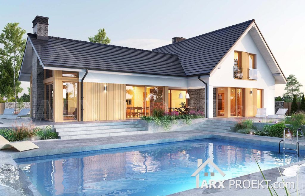 Опис проекту: Сучасний проект будинку для сім’ї із 4-6-осіб, з гаражем на 2 авто, каміном, другим світлом та терасою. Цікавий, сучасний будинок з мансардою, для людей, які люблять виділятися з натовпу. Увагу привертають численні скління в денній зоні. Функціональна компоновка включає відкритий загальний простір, в якому вітальня з’єднана з їдальнею та кухнею. Представницький засклений зал веде до зручного для гостей модуля, що складається із спальні з виходом на терасу, гардеробу для одягу та власної ванної кімнати. Таке поєднання також чудово підходить для сімей з різними поколіннями, забезпечуючи літнім людям відчуття відокремленості та близькості. Перший поверх доповнено також окремим туалетом, кладовою біля кухні, гардеробною кімнатою з проходом до гаража, а потім до паливної. На мансарді є три спальні: дві одинакові по розмірах, загальна ванна кімната та модуль (спальня з окремим гардеробним простором та власна ванна кімната). Перевагою будинку є антресоль з видом на вітальню через друге світло.
