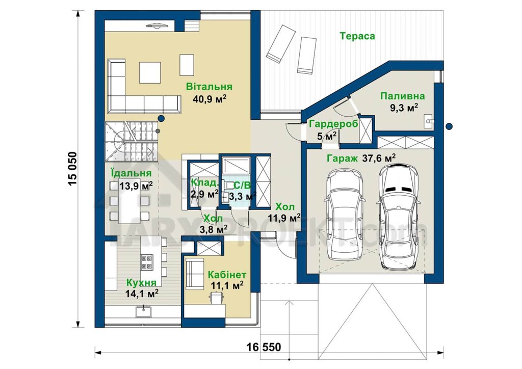 Большая топочная, подойдет для разного вида топлива и гараж для двух авто составляют хозяйственную часть дома.