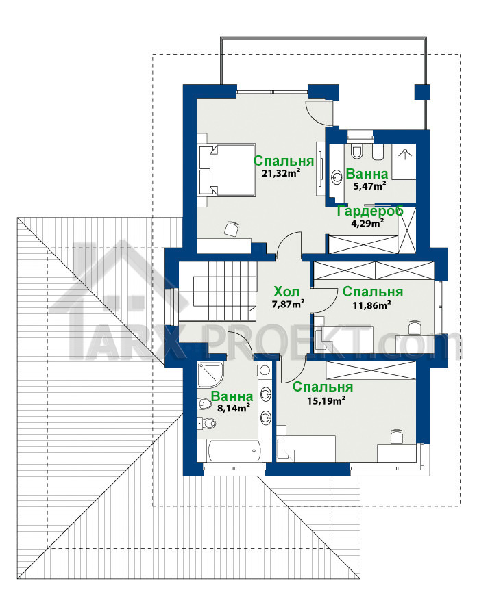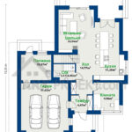 Современный, просторный дом, отличается элегантностью и стилем. Функциональное расположение первого этажа — это, главным образом, дневная зона, в том числе гостиная, где можно хорошо провести время у камина, открытая кухня с мойкой в островки, которая переходит в столовую с выходом на частично крытую террасу. Площадь первого этажа дополняется кабинетом, санузлом с душевой, гаражом для двух машин и подсобным помещением / топливной позади гаража. В холле и тамбуре есть место для шкафов. Из холла также мы можем подняться по лестнице на второй этаж, где разработаны три спальни, в том числе одна с отдельной ванной комнатой и гардеробной, а также выходом на балкон. Другие спальни также просторные и удобные, одна из угловым окном. Все дополняется общей ванной комнатой. Дом может быть с гаражом для одного авто.