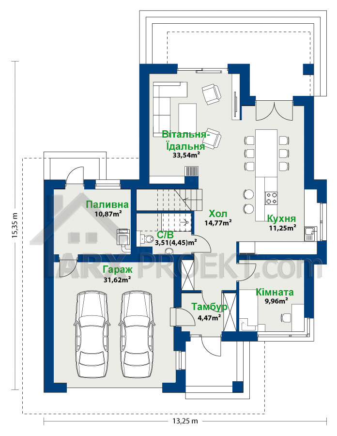 Описание проекта: Красивый проект двухэтажного дома 13х15 с гаражом для двух машин, камином и террасой в современном стиле.