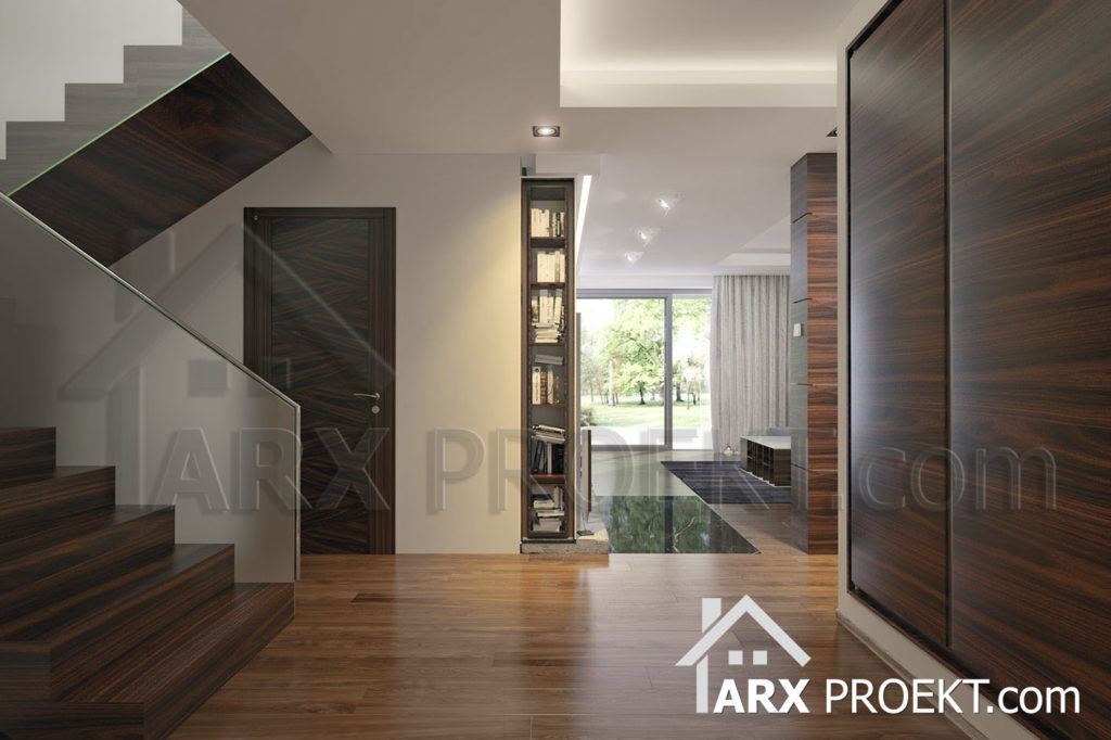 Сучасний, просторий будинок, що відрізняється елегантністю та стилем. Функціональне розташування першого поверху – це, головним чином, денна зона, у тому числі вітальня, де можна добре провести час біля каміна, відкрита кухня , яка переходить у їдальню в еркері та вітальню. Площа першого поверху доповнюється кабінетом, санвузлом з душем, гаражем на одне авто і підсобним приміщенням / паливною. У вестибюлі і в залі є місце для шаф. З холу ми можемо піднятися по сходах на другий поверх, де розроблено три спальні, в тому числі одна з окремою ванною кімнатою і гардеробною, а також виходом на балкон. Інші спальні також просторі і зручні. Все доповнюється спільною ванною кімнатою, та окремою пральнею. Будинок може бути із гаражем для двох авто